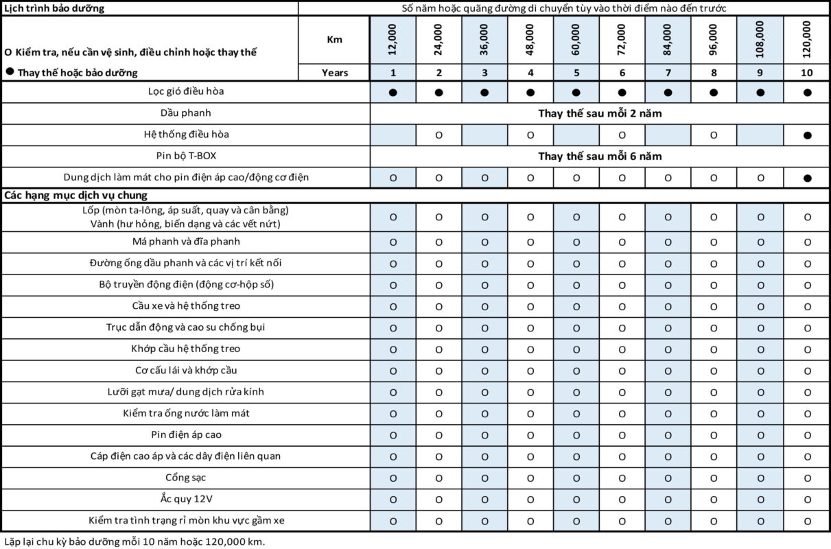 Mỗi 24.000 km: Thay dầu hộp số (nếu cần), vệ sinh lọc gió điều hòa.