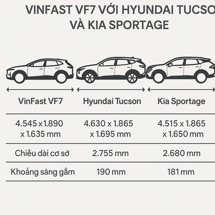 👉 So với các đối thủ, VF7 có chiều dài cơ sở rộng rãi, mang lại không gian nội thất thoải mái.