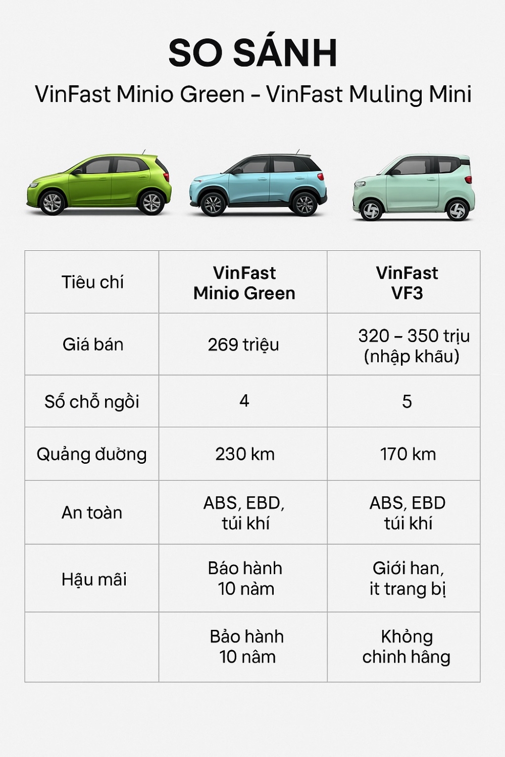 👉 Nhận xét: Minio Green cân bằng giữa giá rẻ – trang bị an toàn – hậu mãi chính hãng, trong khi Wuling rẻ hơn nhưng thiếu dịch vụ.